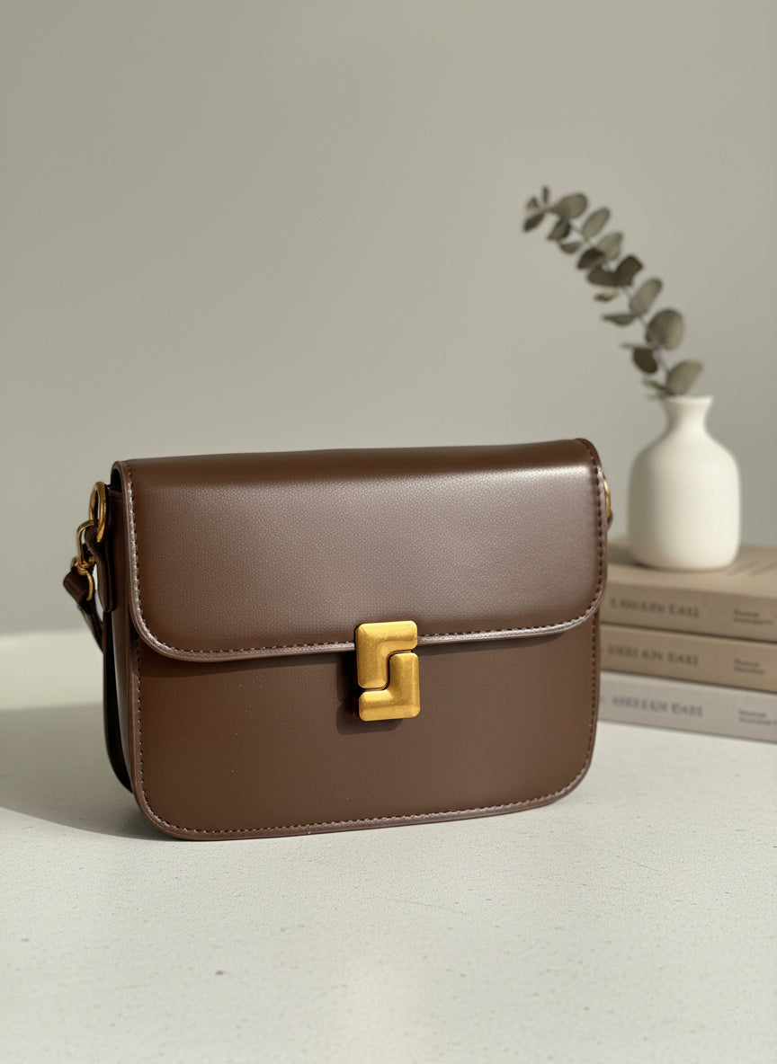 A modern classic with timeless charm- Café Muse embodies sleek sophistication through clean lines and subtle structure. Crafted in smooth mocha brown leather, it’s elevated by a distinctive gold interlock clasp that adds a geometric edge. Compact yet elegant, this piece transitions seamlessly from workdays to evenings out, offering quiet confidence and refined utility.