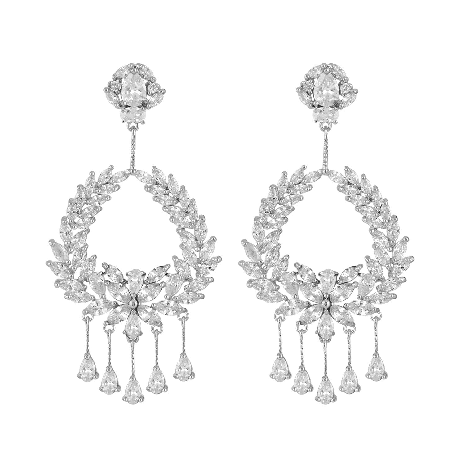 Sparkling with brilliance, these earrings feature an intricate wreath design crafted from marquise-cut crystals, finished with delicate dangling teardrops for added movement and glamour. Made in 925 sterling silver, they exude regal sophistication — perfect for weddings, soirées, and statement evening wear.