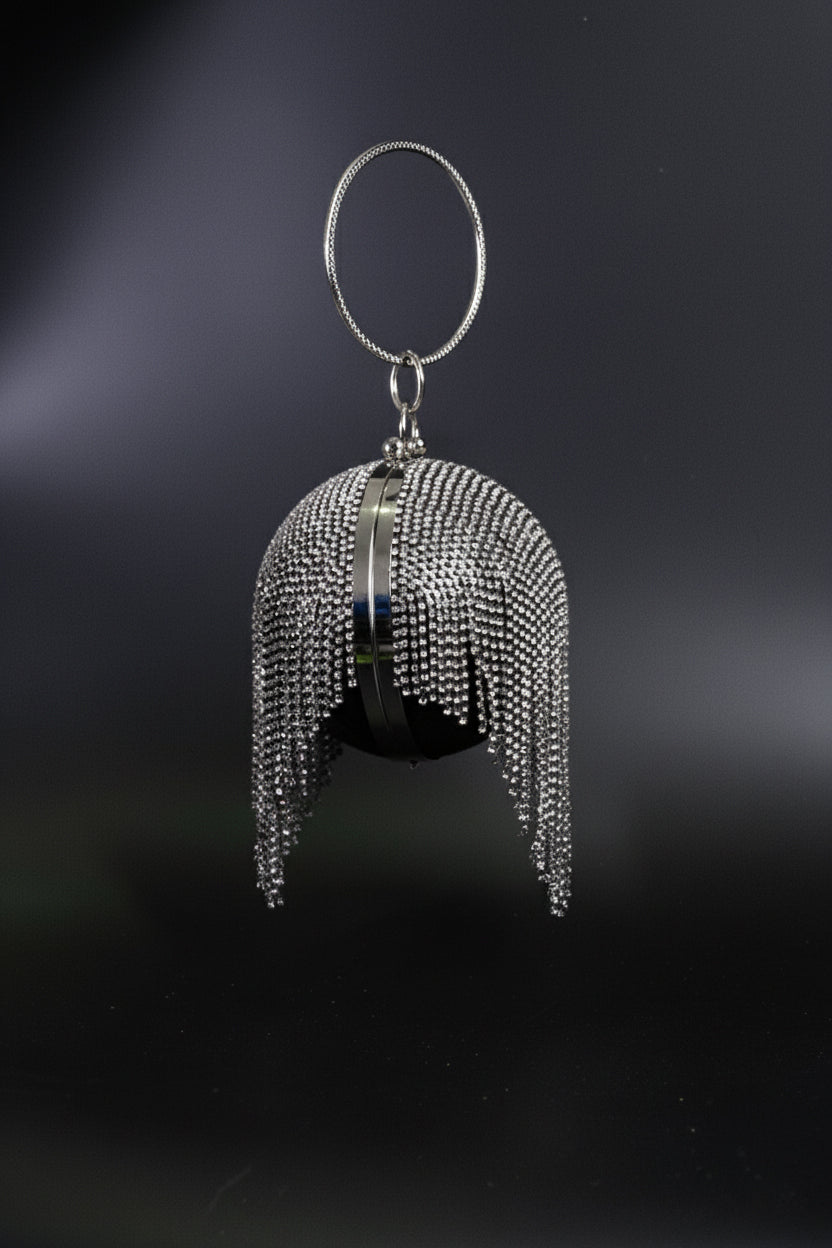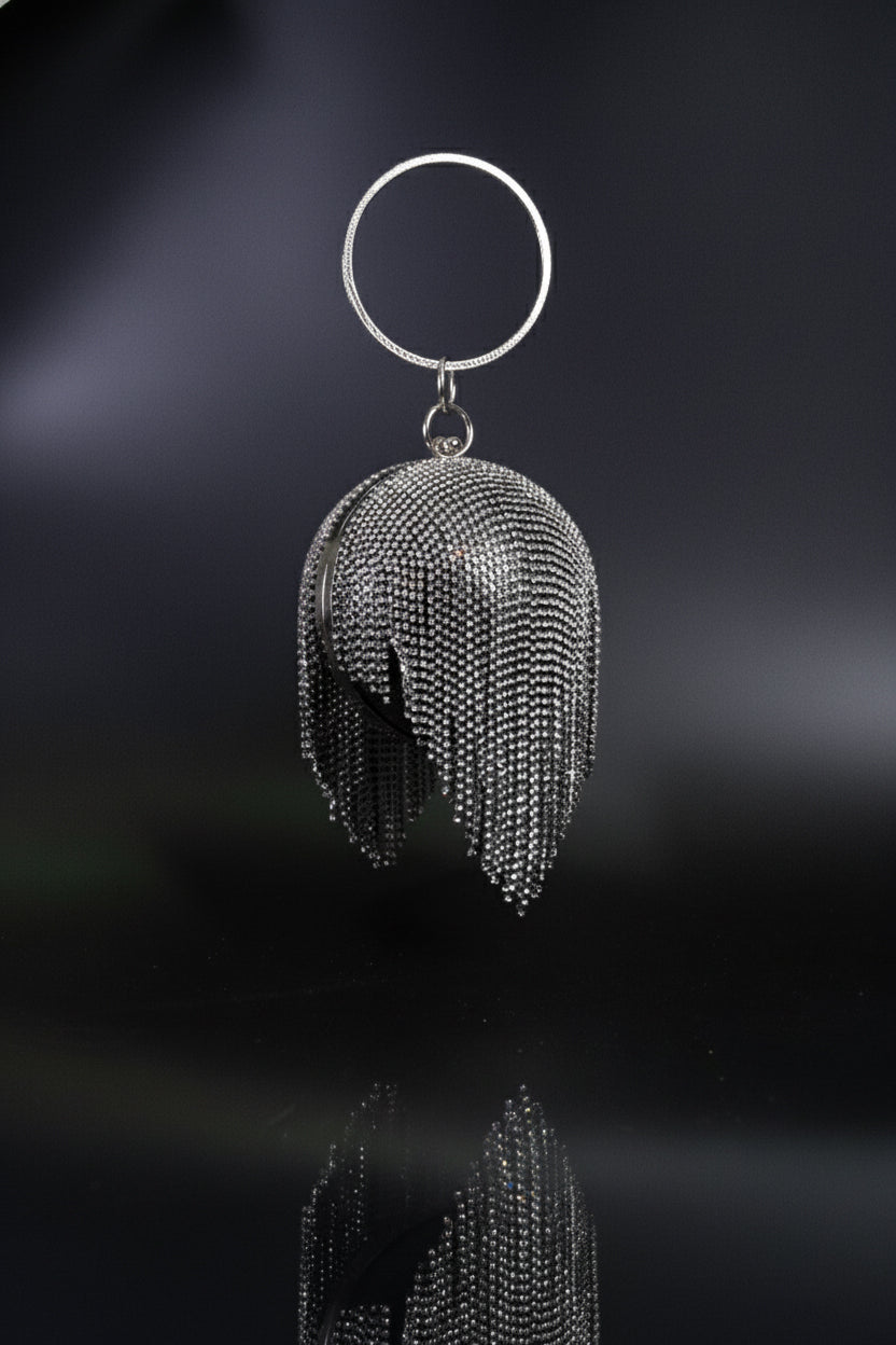 Eclipse Clutch is where sculptural art meets high glamour. Designed in a sleek orb silhouette and drenched in cascading crystal fringes, this clutch captures the rhythm of movement and light. Its bold metallic shimmer and modern circular handle make it a statement accessory that exudes confidence and elegance. Perfect for soirées, red-carpet nights, or cocktail affairs, this piece transforms every gesture into a moment of sparkle.