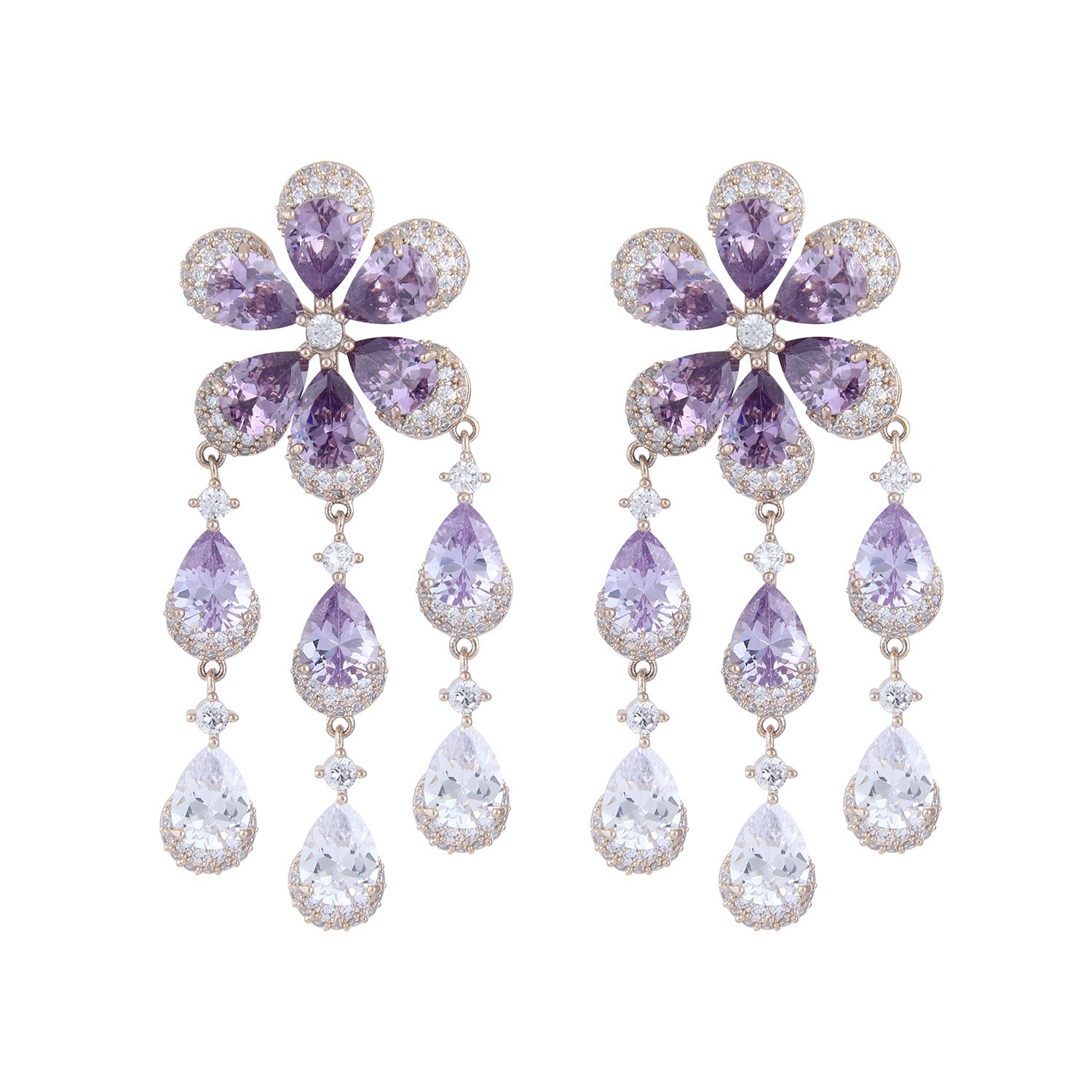 A dazzling blend of elegance and craftsmanship, these earrings are designed in a floral motif with pear-cut amethyst stones surrounded by sparkling crystals. Crafted in 925 sterling silver, the cascading lavender and clear drops add timeless charm, making them an exquisite statement piece for weddings, parties, or evening occasions.