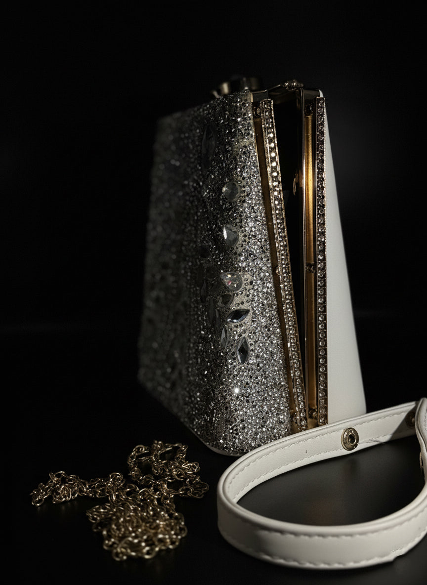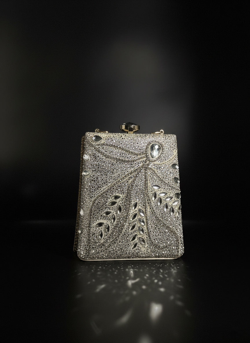 Radiant and refined, a masterpiece of opulence and artistry. Drenched in crystals and embellished with teardrop-cut stones that catch light like constellations, this bag evokes the elegance of starlit nights. Its sculpted structure and intricate leaf-inspired motif bring together celestial charm and regal sophistication — the perfect accessory for weddings, soirées, and grand celebrations.