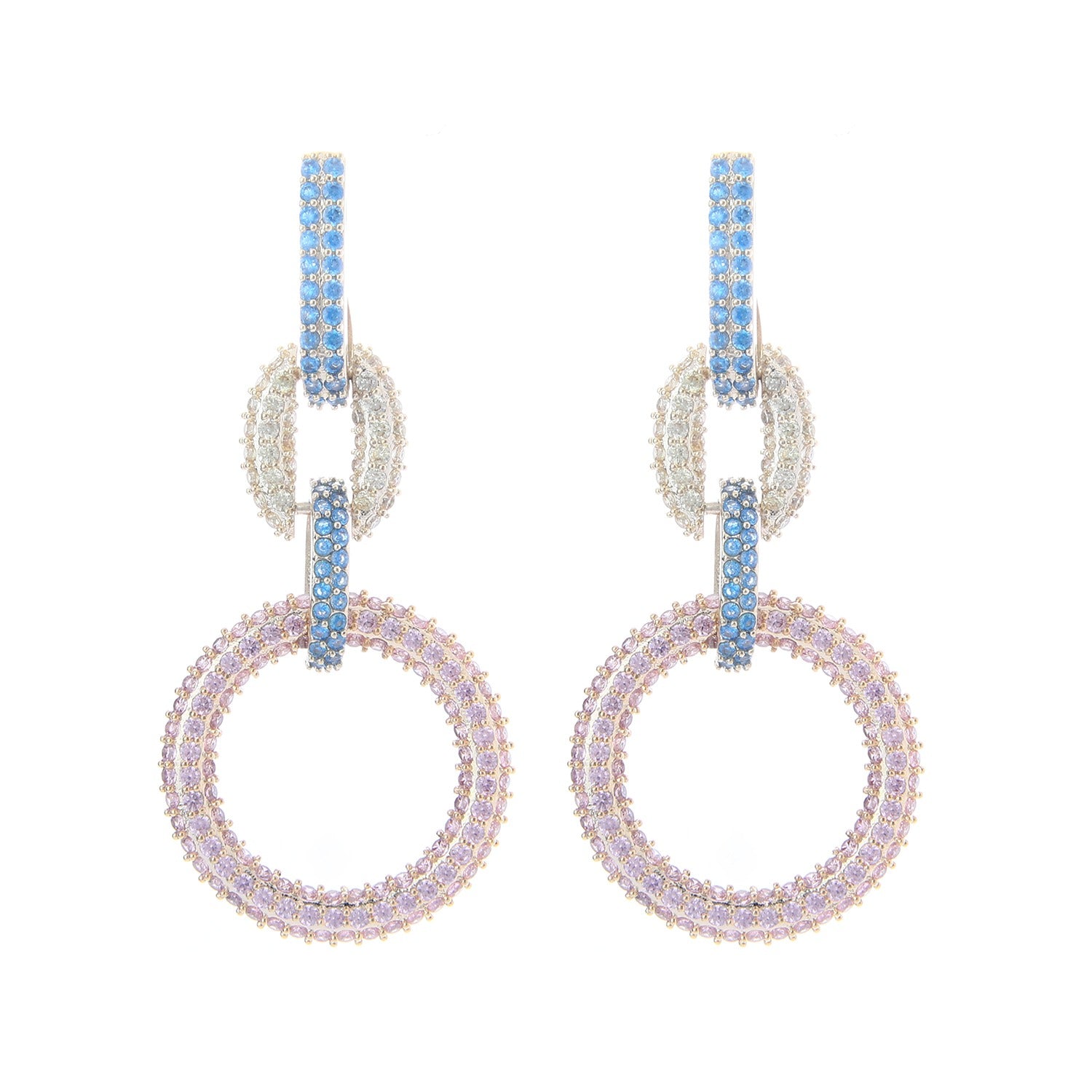 Playful yet sophisticated, these cascading hoop earrings feature a trio of interlinked circles encrusted with shimmering stones in hues of sky blue, champagne, and blush pink. Crafted in 925 sterling silver with a luxurious gold finish, they radiate vibrant elegance — perfect for festive occasions, cocktail nights, or adding a chic pop of colour to evening wear.