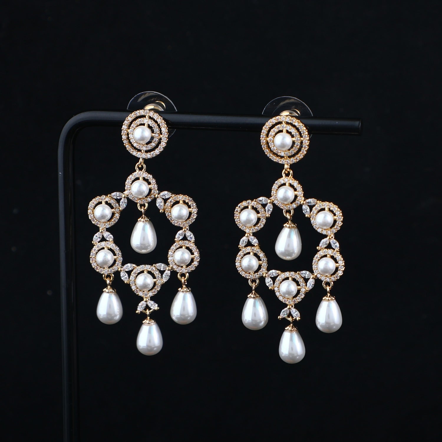 A timeless symbol of sophistication, these chandelier earrings feature luminous pearls framed by sparkling crystals in an intricate design. Crafted in 925 sterling silver with a luxurious gold finish, the cascading teardrop pearls exude elegance and grace — perfect for weddings, soirées, and regal occasions.