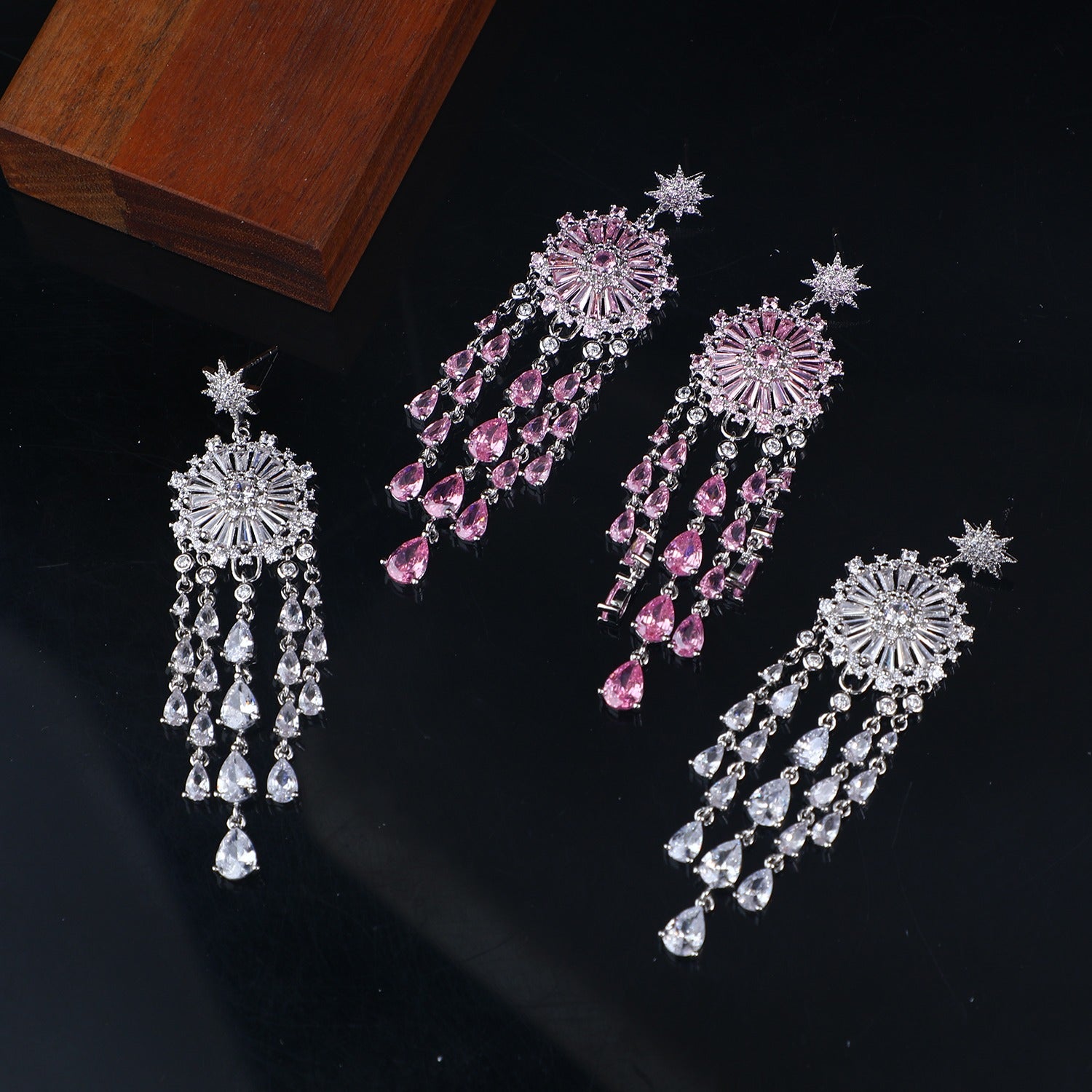 Radiating celestial elegance, these chandelier earrings feature a dazzling starburst design adorned with cascading teardrop crystals. Available in both sparkling white and blush pink, each pair is crafted in 925 sterling silver for timeless brilliance. Perfect for weddings, soirées, and glamorous evenings, these earrings capture the magic of starlight with every movement.