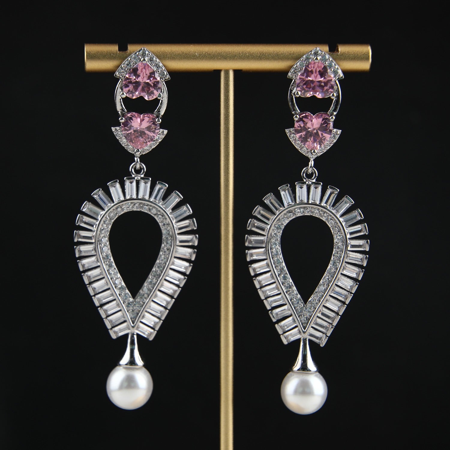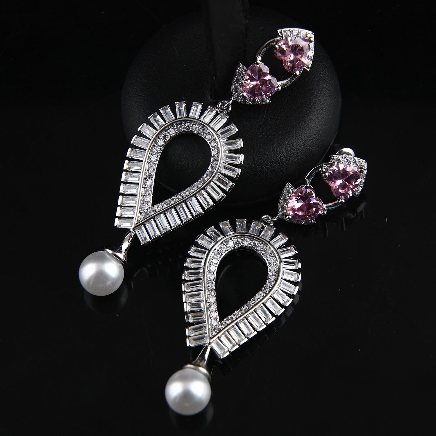 Elevate your look with the exquisite Nova Drop Earrings. These elegant pieces are meticulously crafted from genuine 925 sterling silver, a premium base chosen for its quality and durability. . The intricate teardrop design, set with sparkling diamond simulants, cradles a delicate pink sapphire-hued stone. A lustrous pearl hangs gracefully at the base, creating a timeless and sophisticated silhouette.